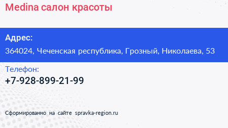 Medina, салон красоты по адресу 364024, Чеченская республика, Грозный, Николаева, 53 в дальнейшем Организация, размещена в следующих категориях: