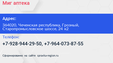 Миг, аптека по адресу 364020, Чеченская республика, Грозный, Старопромысловское шоссе, 24 к2 в дальнейшем Организация, размещена в следующих категориях:
