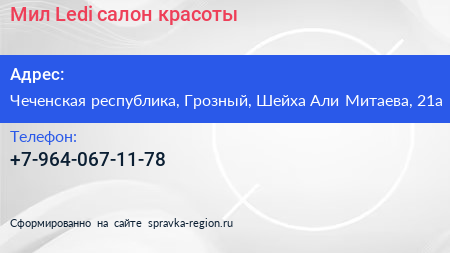 Мил Ledi, салон красоты по адресу Чеченская республика, Грозный, Шейха Али Митаева, 21а в дальнейшем Организация, размещена в следующих категориях: