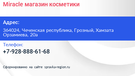 Miracle, магазин косметики по адресу 364024, Чеченская республика, Грозный, Хамзата Орзамиева, 20а в дальнейшем Организация, размещена в следующих категориях: