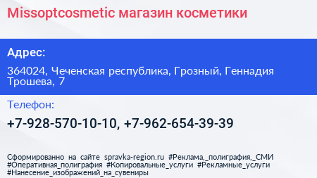 Missoptcosmetic, магазин косметики по адресу 364024, Чеченская республика, Грозный, Геннадия Трошева, 7 в дальнейшем Организация, размещена в следующих категориях: