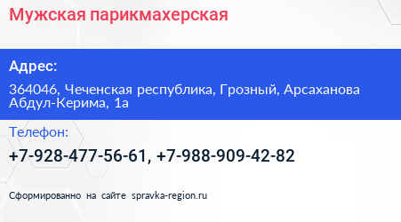 Мужская парикмахерская по адресу 364046, Чеченская республика, Грозный, Арсаханова Абдул-Керима, 1а в дальнейшем Организация, размещена в следующих категориях: