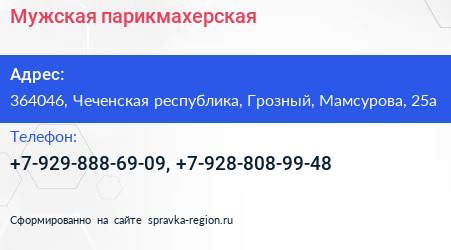 Мужская парикмахерская по адресу 364046, Чеченская республика, Грозный, Мамсурова, 25а в дальнейшем Организация, размещена в следующих категориях: