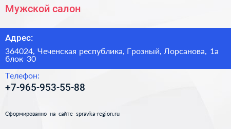 Мужской салон по адресу 364024, Чеченская республика, Грозный, Лорсанова, 1а блок 30 в дальнейшем Организация, размещена в следующих категориях: