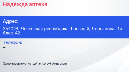 Надежда, аптека по адресу 364024, Чеченская республика, Грозный, Лорсанова, 1а блок 42 в дальнейшем Организация, размещена в следующих категориях: