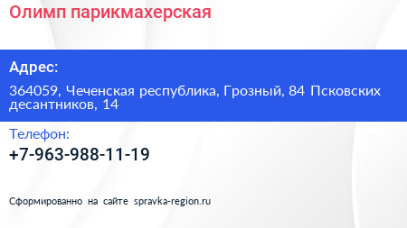 Олимп, парикмахерская по адресу 364059, Чеченская республика, Грозный, 84 Псковских десантников, 14 в дальнейшем Организация, размещена в следующих категориях: