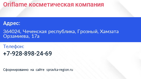 Oriflame, косметическая компания по адресу 364024, Чеченская республика, Грозный, Хамзата Орзамиева, 17а в дальнейшем Организация, размещена в следующих категориях: