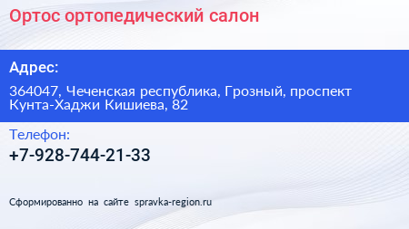 Ортос, ортопедический салон по адресу 364047, Чеченская республика, Грозный, проспект Кунта-Хаджи Кишиева, 82 в дальнейшем Организация, размещена в следующих категориях: