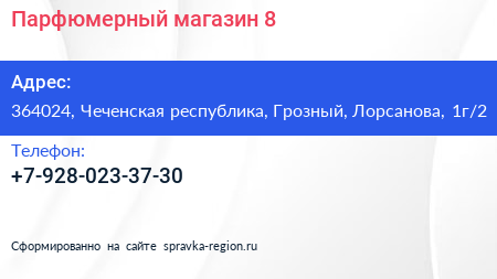 Парфюмерный магазин №8 по адресу 364024, Чеченская республика, Грозный, Лорсанова, 1г/2 в дальнейшем Организация, размещена в следующих категориях: