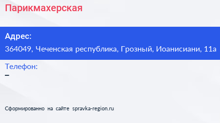 Парикмахерская по адресу 364049, Чеченская республика, Грозный, Иоанисиани, 11а в дальнейшем Организация, размещена в следующих категориях: