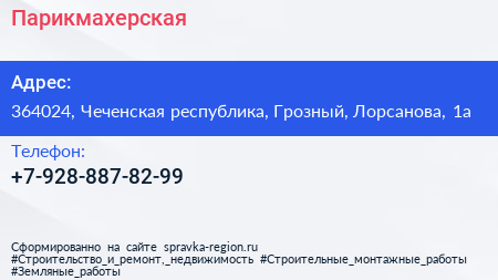 Парикмахерская по адресу 364024, Чеченская республика, Грозный, Лорсанова, 1а в дальнейшем Организация, размещена в следующих категориях: