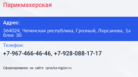 Парикмахерская по адресу 364024, Чеченская республика, Грозный, Лорсанова, 1а блок 30 в дальнейшем Организация, размещена в следующих категориях: