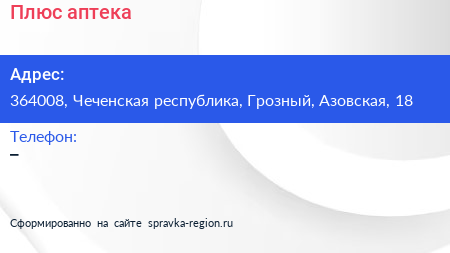 Плюс, аптекa по адресу 364008, Чеченская республика, Грозный, Азовская, 18 в дальнейшем Организация, размещена в следующих категориях: