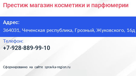 Престиж, магазин косметики и парфюмерии по адресу 364031, Чеченская республика, Грозный, Жуковского, 16д в дальнейшем Организация, размещена в следующих категориях: