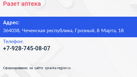 Разет, аптека по адресу 364038, Чеченская республика, Грозный, 8 Марта, 18 в дальнейшем Организация, размещена в следующих категориях:
