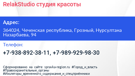 RelakStudio, студия красоты по адресу 364024, Чеченская республика, Грозный, Нурсултана Назарбаева, 94 в дальнейшем Организация, размещена в следующих категориях:
