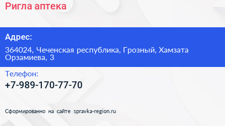 Ригла, аптека по адресу 364024, Чеченская республика, Грозный, Хамзата Орзамиева, 3 в дальнейшем Организация, размещена в следующих категориях: