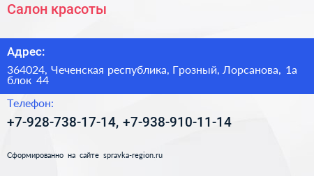 Салон красоты по адресу 364024, Чеченская республика, Грозный, Лорсанова, 1а блок 44 в дальнейшем Организация, размещена в следующих категориях: