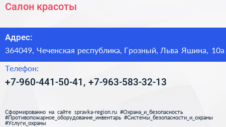 Салон красоты по адресу 364049, Чеченская республика, Грозный, Льва Яшина, 10а в дальнейшем Организация, размещена в следующих категориях: