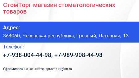 СтомТорг, магазин стоматологических товаров по адресу 364060, Чеченская республика, Грозный, Лагерная, 13 в дальнейшем Организация, размещена в следующих категориях: