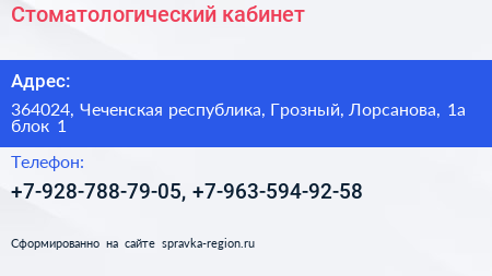 Стоматологический кабинет по адресу 364024, Чеченская республика, Грозный, Лорсанова, 1а блок 1 в дальнейшем Организация, размещена в следующих категориях: