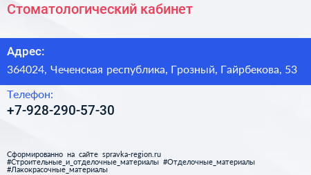 Стоматологический кабинет по адресу 364024, Чеченская республика, Грозный, Гайрбекова, 53 в дальнейшем Организация, размещена в следующих категориях:
