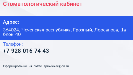 Стоматологический кабинет по адресу 364024, Чеченская республика, Грозный, Лорсанова, 1а блок 40 в дальнейшем Организация, размещена в следующих категориях: