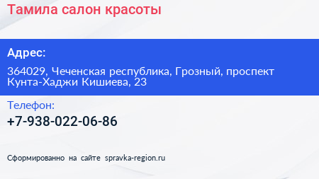 Тамила, салон красоты по адресу 364029, Чеченская республика, Грозный, проспект Кунта-Хаджи Кишиева, 23 в дальнейшем Организация, размещена в следующих категориях: