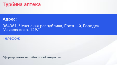 Турбина, аптека по адресу 364061, Чеченская республика, Грозный, Городок Маяковского, 129/1 в дальнейшем Организация, размещена в следующих категориях: