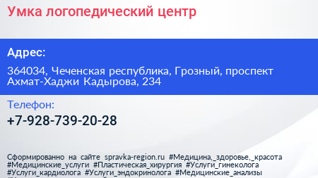Умка, логопедический центр по адресу 364034, Чеченская республика, Грозный, проспект Ахмат-Хаджи Кадырова, 234 в дальнейшем Организация, размещена в следующих категориях: