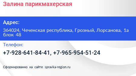Залина, парикмахерская по адресу 364024, Чеченская республика, Грозный, Лорсанова, 1а блок 48 в дальнейшем Организация, размещена в следующих категориях: