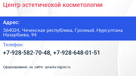 Центр эстетической косметологии по адресу 364024, Чеченская республика, Грозный, Нурсултана Назарбаева, 94 в дальнейшем Организация, размещена в следующих категориях: