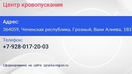 Центр кровопускания по адресу 364059, Чеченская республика, Грозный, Вахи Алиева, 183 в дальнейшем Организация, размещена в следующих категориях: