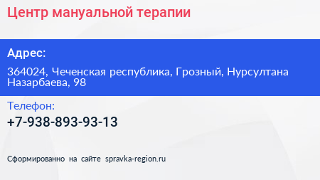 Центр мануальной терапии по адресу 364024, Чеченская республика, Грозный, Нурсултана Назарбаева, 98 в дальнейшем Организация, размещена в следующих категориях: