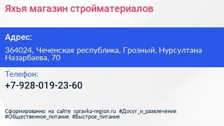 Яхья, магазин стройматериалов по адресу 364024, Чеченская республика, Грозный, Нурсултана Назарбаева, 70 в дальнейшем Организация, размещена в следующих категориях: