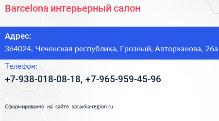 Barcelona, интерьерный салон по адресу 364024, Чеченская республика, Грозный, Авторханова, 26а в дальнейшем Организация, размещена в следующих категориях: