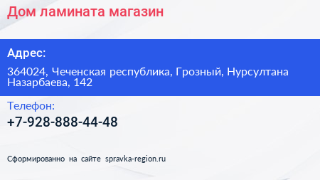 Дом ламината, магазин по адресу 364024, Чеченская республика, Грозный, Нурсултана Назарбаева, 142 в дальнейшем Организация, размещена в следующих категориях: