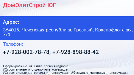 ДомЭлитСтрой—ЮГ по адресу 364015, Чеченская республика, Грозный, Краснофлотская, 7/1 в дальнейшем Организация, размещена в следующих категориях: