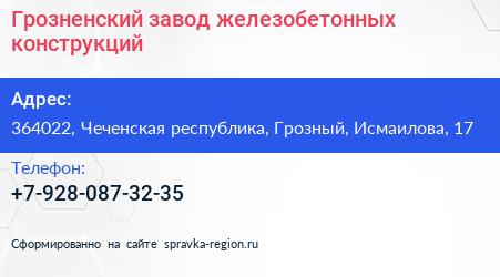 Грозненский завод железобетонных конструкций по адресу 364022, Чеченская республика, Грозный, Исмаилова, 17 в дальнейшем Организация, размещена в следующих категориях: