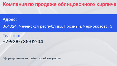 Компания по продаже облицовочного кирпича по адресу 364024, Чеченская республика, Грозный, Чернокозова, 3 в дальнейшем Организация, размещена в следующих категориях: