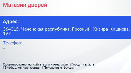 Магазин дверей по адресу 364015, Чеченская республика, Грозный, Хизира Кишиева, 197 в дальнейшем Организация, размещена в следующих категориях: