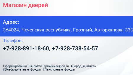 Магазин дверей по адресу 364024, Чеченская республика, Грозный, Авторханова, 33Б в дальнейшем Организация, размещена в следующих категориях: