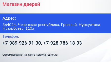 Магазин дверей по адресу 364024, Чеченская республика, Грозный, Нурсултана Назарбаева, 110а в дальнейшем Организация, размещена в следующих категориях: