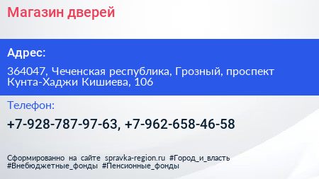Магазин дверей по адресу 364047, Чеченская республика, Грозный, проспект Кунта-Хаджи Кишиева, 106 в дальнейшем Организация, размещена в следующих категориях: