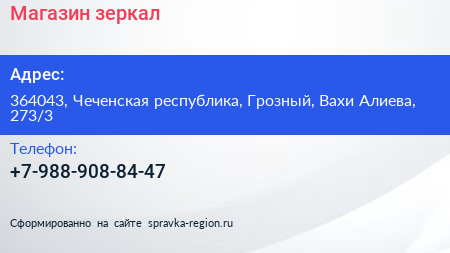 Магазин зеркал по адресу 364043, Чеченская республика, Грозный, Вахи Алиева, 273/3 в дальнейшем Организация, размещена в следующих категориях: