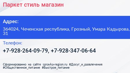 Паркет стиль, магазин по адресу 364024, Чеченская республика, Грозный, Умара Кадырова, 31 в дальнейшем Организация, размещена в следующих категориях: