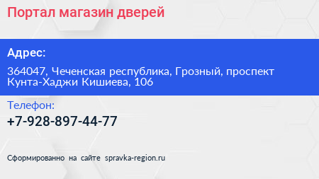 Портал, магазин дверей по адресу 364047, Чеченская республика, Грозный, проспект Кунта-Хаджи Кишиева, 106 в дальнейшем Организация, размещена в следующих категориях: