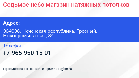 Седьмое небо, магазин натяжных потолков по адресу 364038, Чеченская республика, Грозный, Новопромысловая, 34 в дальнейшем Организация, размещена в следующих категориях: