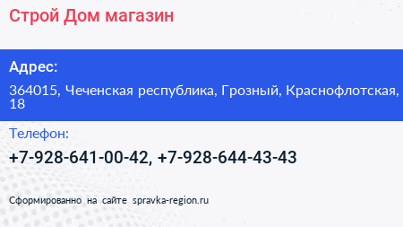 Строй Дом, магазин по адресу 364015, Чеченская республика, Грозный, Краснофлотская, 18 в дальнейшем Организация, размещена в следующих категориях:
