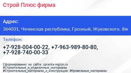 Строй-Плюс, фирма по адресу 364031, Чеченская республика, Грозный, Жуковского, 8ж в дальнейшем Организация, размещена в следующих категориях: